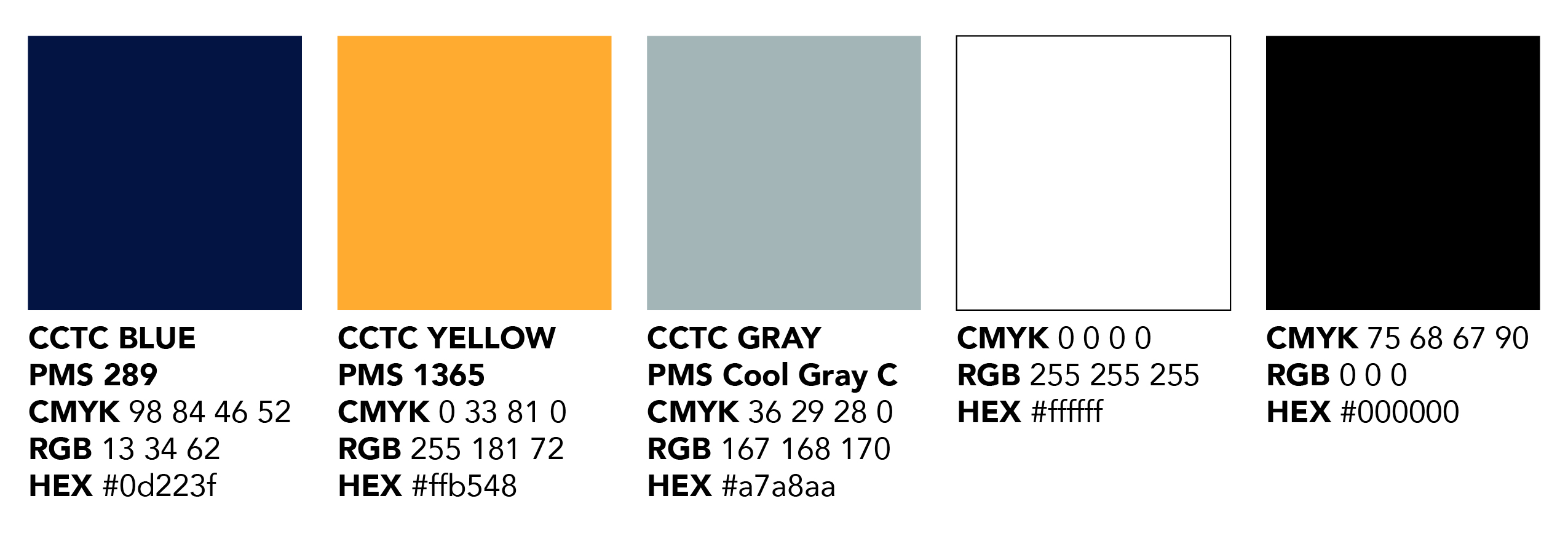 CCTC uses navy blue and gold as its two primary colors. Other colors have been added to the college’s color palette to complement the official colors. They should not replace or overpower CCTC’s primary colors. Colors appear differently on your computer monitor than they do in print.