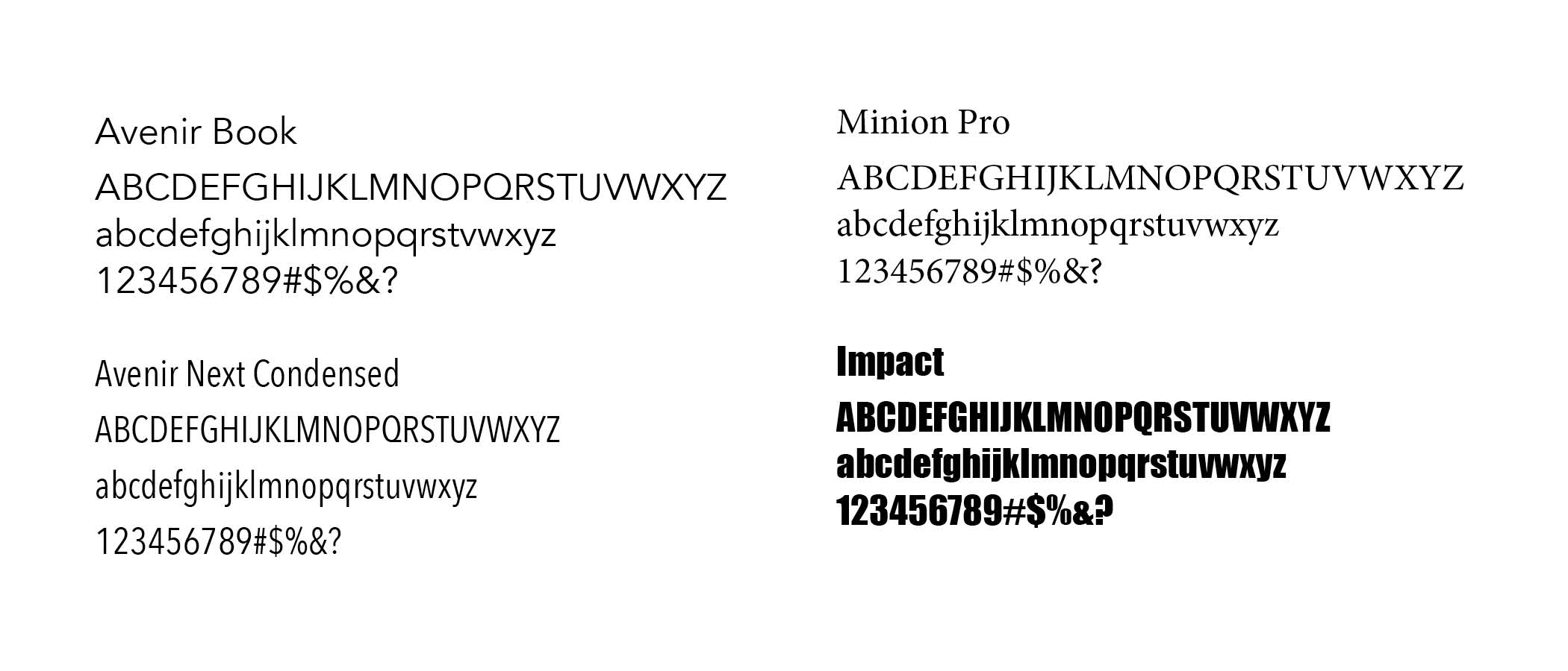 The four primary fonts used in CCTC college publications are Avenir, Avenir Next Condensed, Minion Pro and Impact. Other fonts may be used in lieu of Avenir such as Arial or Century Gothic.