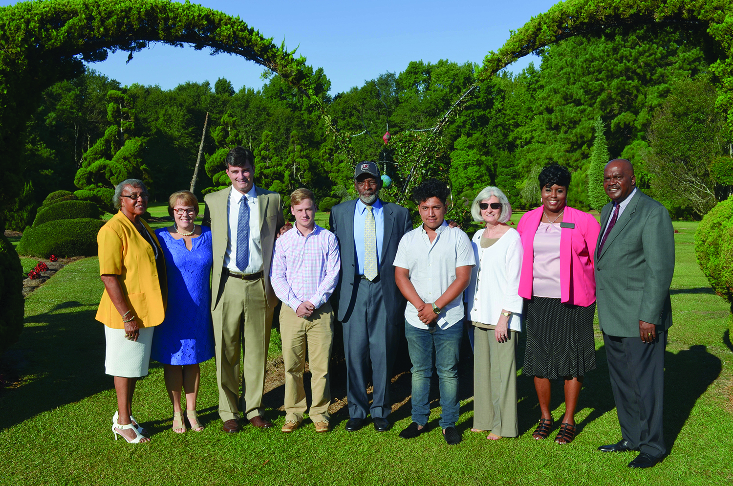 Ruby Gibbs, Vice Chair CCTC Foundation; Maria Watson, Robert E. Lee Academy; Dr. Michael Mikota, CCTC President; Cody Watson, Scholarship Recipient from Robert E. Lee Academy; Pearl Fryar; Jesus Diaz, Scholarship Recipient from Lee Central High School; Meree McAlister, CCTC Foundation Executive Director; Dr. Kuterah Donald, Lee County School District; Rev. Jerome McCray, Friends of Pearl Fryar’s Topiary Garden President.